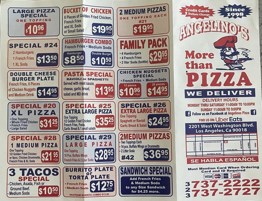 Welcome to Angelino's Pizza, located at 2201 W Washington Blvd in Los Angeles, CA, where flavor and community come together. This vibrant eatery not only excels in its mouthwatering pizzas, such as the beloved ham and pineapple with extra cheese, but also extends its culinary reach through a diverse menu that includes delicious wings, tacos, and seafood dishes.